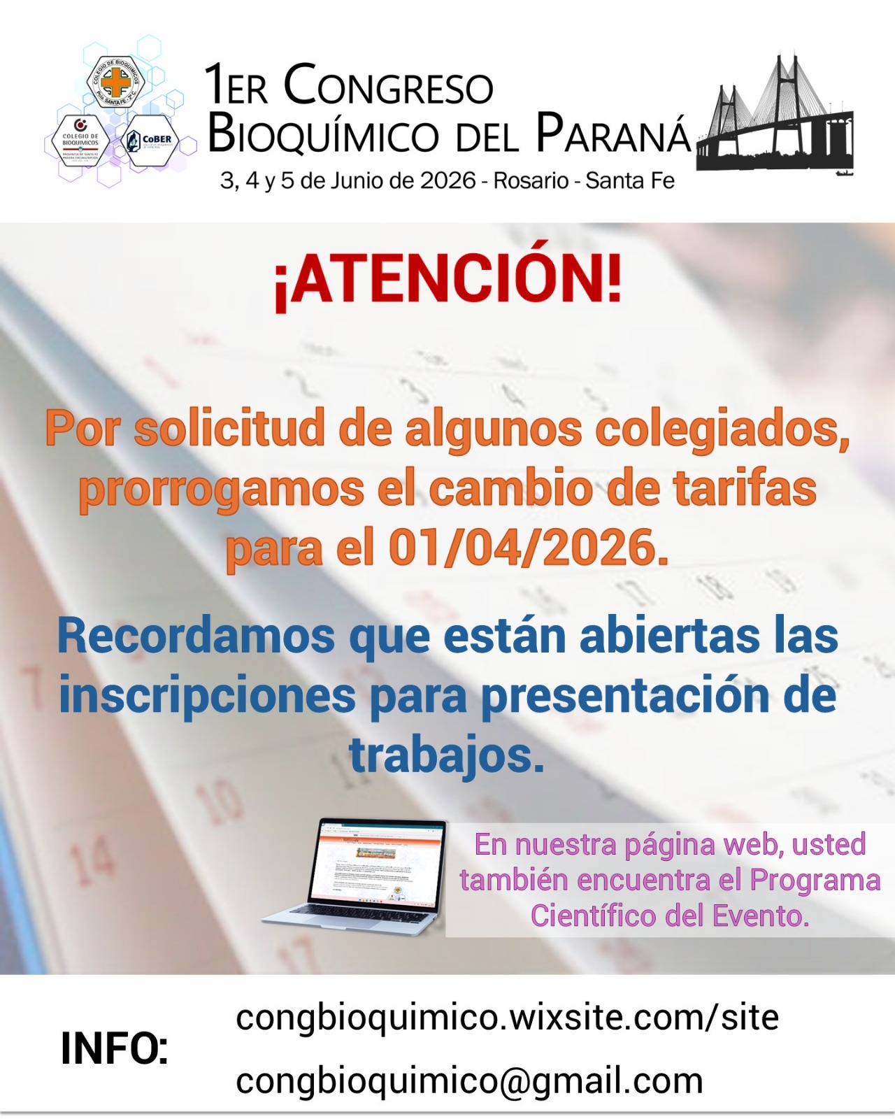El 1er Congreso Bioquímico del Paraná se llevará a cabo en la ciudad de Rosario, Santa Fe los días 3, 4 y 5 de Junio de 2026 y el CoBER ofrece a sus matriculados que deseen participar facilidades de pago: